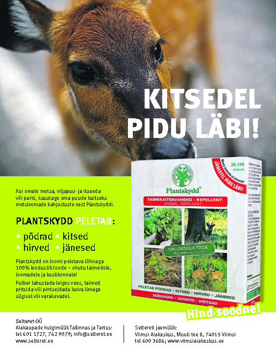 01.11 Metsloomade peletamine Kui omate metsa, viljapuu- ja iluaeda või parki, kasutage oma puude kaitseks metsloomade kahjustuste eest Plantskyddi. Plantskydd peletab põdrad, kitsed, hirved ja jänesed. Pulber lahustada leiges vees, taimed pritsida või pintseldada kuiva ilmaga sügisel või varakevadel. Kitsede ja põtrade eest kaitseks/peletamiseks pritsida peamiselt ladvad. Jäneste eest kaitseks pritsida või pintseldada tüved ja […]