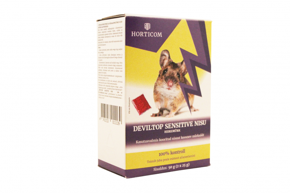 Мышиный яд Deviltop Sensitive пшеница - это готова к использованию приманка, упакованная в мешочки по одной дозе 25 г для домашних мышей на всех этапах развития; он содержит очень сильное соединение бродифакум, после приема которого начинает действовать антикоагулянт второго поколения. Благодаря его действию смерть грызуна наступает, не вызывая у других членов колонии подозрений в отношении приманки. Зерно Deviltop sensitive является приманкой для грызунов, содержит очищенное зерно и является очень привлекательным для вышеперечисленных видов грызунов, потому что оно обогащено питательными компонентами и произведено по технологии SAT (специальная абсорпционная технология), которая позволяет обеспечить гомогенное распределение действующего вещества как по поверхности зерна, так и внутри него. Эта приманка идеальна для обработки в таких ситуациях, когда грызуны питаются в основном зернами кукурузы, например, в региональных и зоотехнических зданиях. Deviltop Sensitive пшеница содержит непр