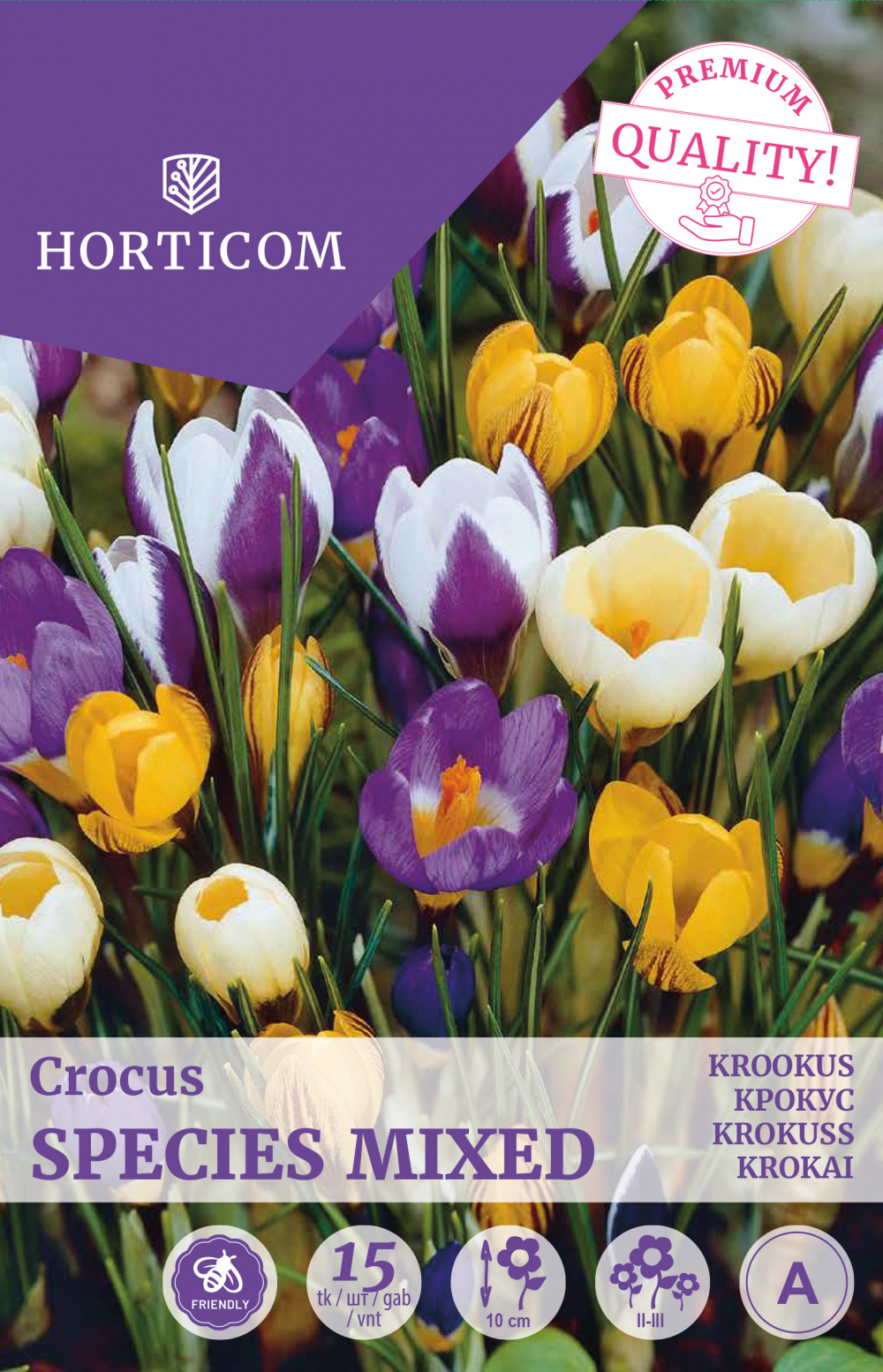 Смесь крокусов Species Mix - смесь лавандового, пурпурного, желтого и белого цветов. Лучшее время для посадки - сентябрь, но теплой осенью можно делать и в октябре. Предпочитают умеренно влажную, богатую перегноем, рыхлую садовую почву и солнечные или полутенистые места с хорошим дренажем. Сажайте на глубину 5-7 см, поместив в посадочную яму слой песка, чтобы предотвратить гниение луковиц. Весенние крокусы могут расти на одном месте 3-5 лет. Затем его собирают после того, как листья пожелтели, и высаживают на большей площади. Лучшее время для этого - конец лета. Маленькие луковицы крокусов высаживают на глубину около 5 см.