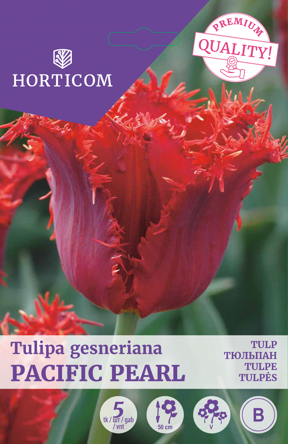 Тюльпан Тихоокеанская жемчужина - красивый насыщенно-красный сорт. Предпочитает расти в солнечном месте с влажной почвой. Наиболее подходящее время для посадки - сентябрь, но в зависимости от погоды может быть и конец октября. Общее правило посадки цветочных луковиц - они должны попасть в почву за 6 недель до того, как почва окончательно промерзнет. Тюльпаны больше всего любят солнечную среду обитания и плодородные, легкие, нейтральные, слабощелочные или кислые песчаные почвы. Также важна хорошая водопроницаемость, чтобы луковицы не гнили. Посадите на три луковицы в глубину. Примерно за неделю до цветения они хотят напиться, поэтому, если нет дождя, их следует полить, а затем оставить влажными в течение нескольких недель, после чего их можно оставить в покое. Тюльпаны нуждаются в холодном сезоне, они начнут расти осенью. Всходы переносят до -15 градусов ниже нуля, но цветы намного сильнее боятся холода. Высота 50 см.