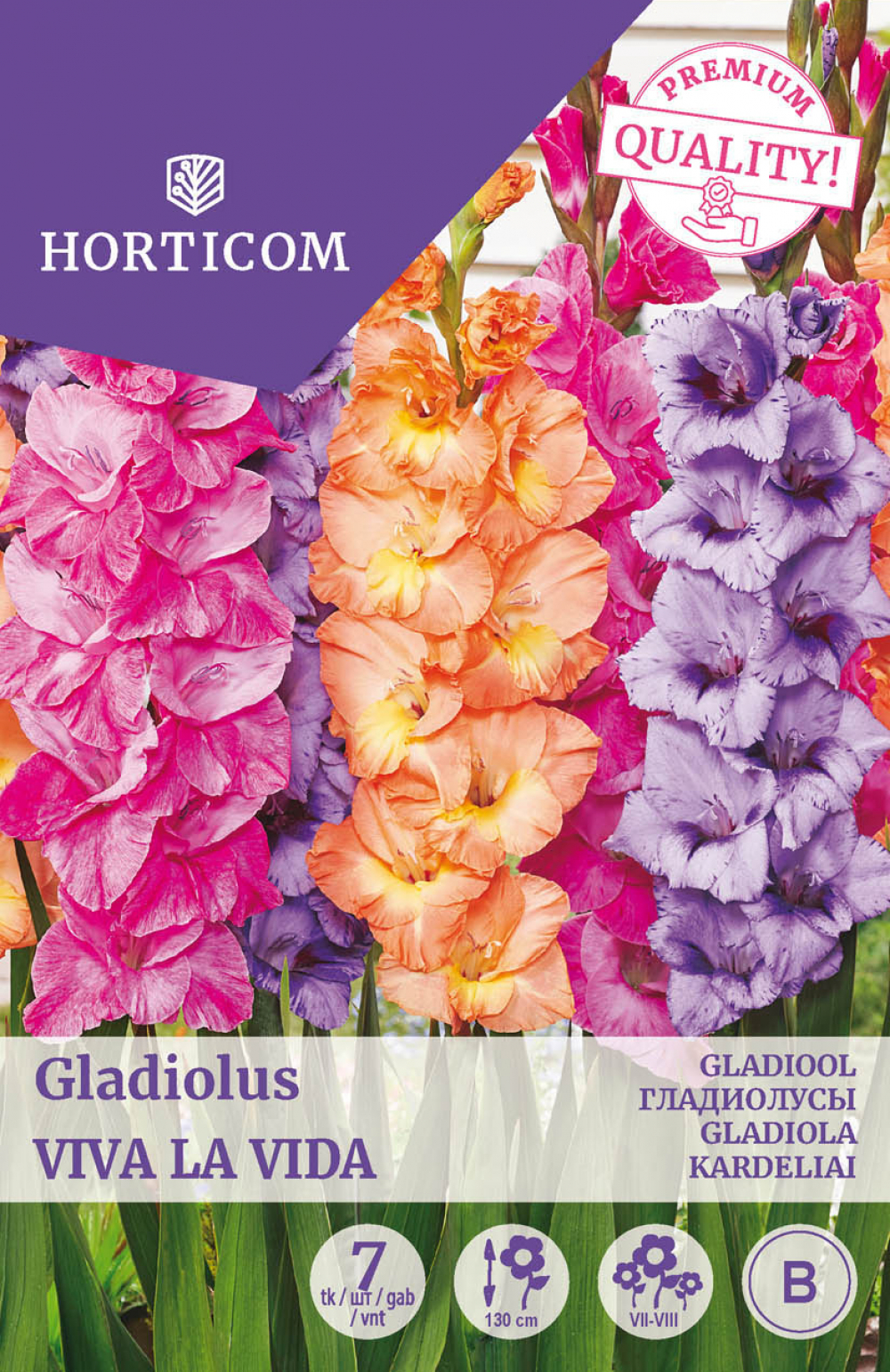Gladiool Viva La Vida õied on erineva värvusega. Sobib nii aias kasvamiseks kui ka lõikelilleks. Kuigi kaunid gladioolid kasvavad meie kliimas võrdlemisi hästi, on nad külmaõrnad. Ületalve tuleb gladioolide mugulsibulaid hoida sisetingimustes. Sibulad suurusega 12/14 õitsevad tavaliselt rikkalikult, õisik on normaal suurusega, vars tugev ja võimalik saada normaalse suurusega tütarsibulaid. Lehtede värvus on heledast kuni sinakasroheliseni. Nad on tugevad ja kaetud vahakihiga. Lehtede pikkus on 30–140 cm, laius aga 2–8,5 cm. Gladioolid armastavad päikselist kasvukohta, kus muld on 30–40 sügavuselt haritud, viljakas ja kergelt happeline. Gladioolid armastavad päikselist kasvukohta. Lille kõrgus on 130cm.