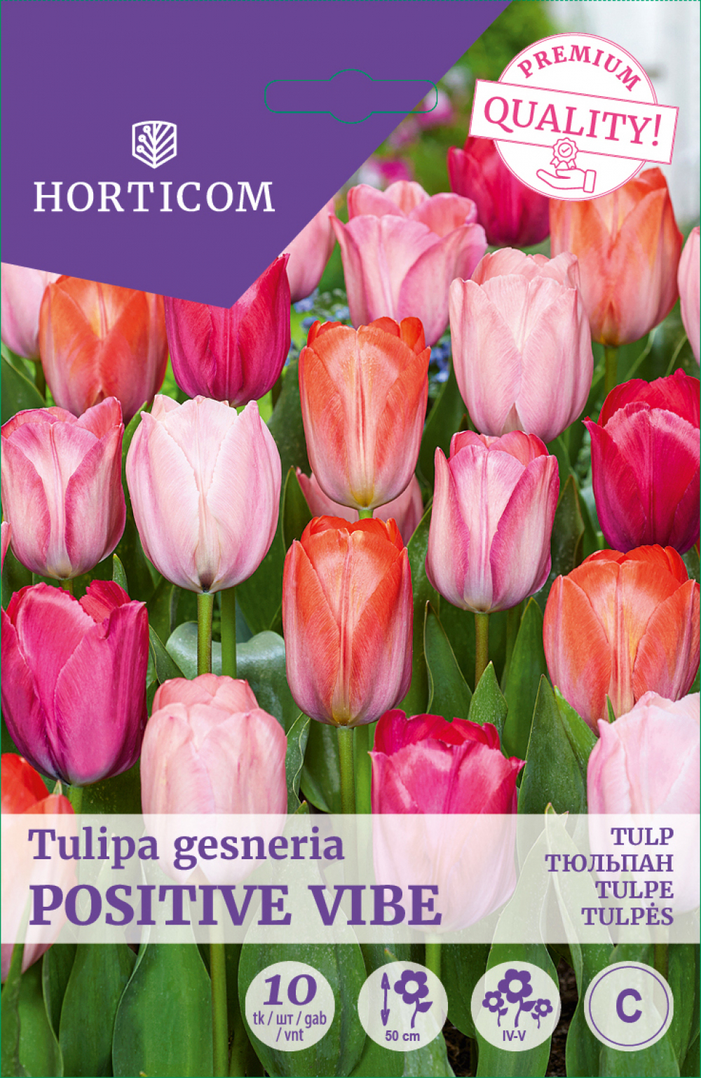 Tulp Positive Vibe on kaunite erinevate värvidega õite segu. Sobivaim mahapanekuaeg on september, kuid olenevalt ilmastikust võib ka oktoobri lõpus. Lillesibulate üldine istutamise reegel on, et nad peaksid saama mulda 6 nädalat enne pinnase püsivat külmumist. Päikeseline kasvukoht ja viljakas, kerge, neutraalne kuni kergelt aluseline või happeline liivmuld meeldivad tulpidele enim. Tähtis on ka vee hea läbilaskvus, et sibulad mädanema ei läheks. Istutada kolme sibula kõrguse sügavusele. Umbes nädal enne õitsemist tahavad nad juua, nii-et kui vihma pole, tuleks neid kasta ja hoida siis neid niiskuses veel paar-kolm nädalat, seeärel võib nad rahule jätta. Tulbid vajavad külmaperioodi, nad hakkavad kasvama juba sügisel. Tõusmed kannatavad kuni -15 kraadist külma, kui õied on märksa külmakartlikumad. Õitsemisaeg aprill. Taimekõrgus 50cm.